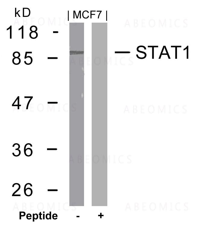 Figure 1: Western blot analysis of extracts from MCF7 cells using STAT1(Ab-727) Antibody 35-1519 and the same antibody preincubated with blocking peptide.