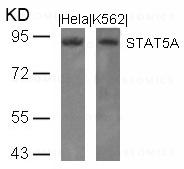 Figure 1: Western blot analysis of extracts from Hela and K562 cells using STAT5A(Ab-694) Antibody 35-1403 .