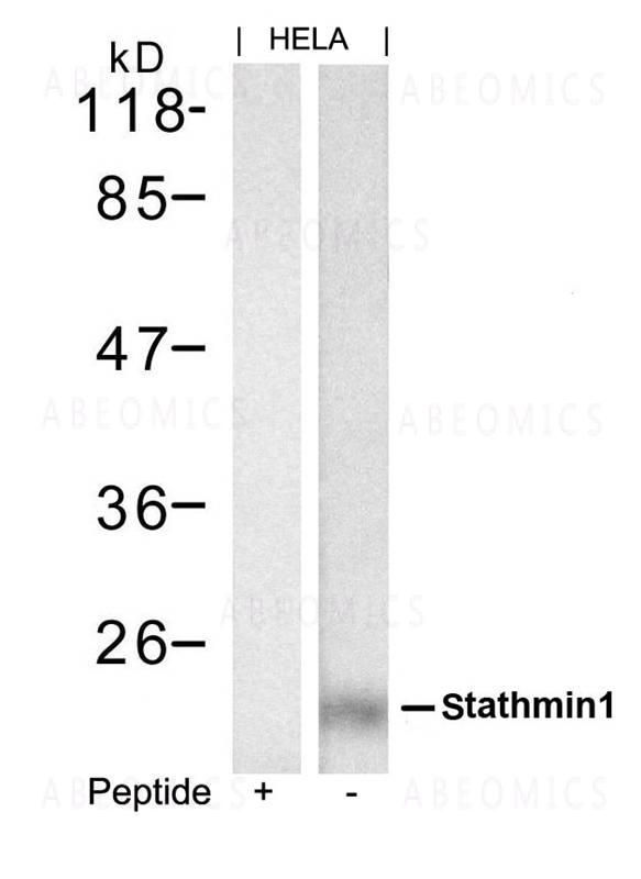 Figure 1: Western blot analysis of extracts from Hela cells using stathmin1(Ab-62) Antibody 35-1732 and the same antibody preincubated with blocking peptide.