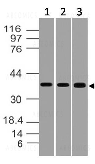 Fig-1: Western blot analysis of STRAP. Anti-STRAP antibody (11-8036) was used at 1 µg/ml on (1) Hela, (2) Jurkat and (3) HCT-116 lysates.