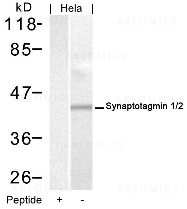 Figure 1: Western blot analysis of extracts from Hela cells using Synaptotagmin 1/2(Ab-202/199) Antibody 35-1622 and the same antibody preincubated with blocking peptide.