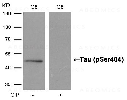 Figure 1: Western blot analysis of extracts from C6 cells, treated with calf intestinal phosphatase (CIP), using Tau (Phospho-Ser404) Antibody 35-1109 .