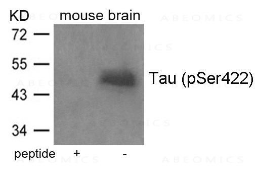 Figure 1: Western blot analysis of extracts from mouse brain tissue using Tau(Phospho-Ser422) Antibody 35-1249 and the same antibody preincubated with blocking peptide.