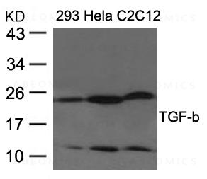 Figure 1: Western blot analysis of extracts from 293, Hela and C2C12 cells using TGF-b Antibody 35-1846 .