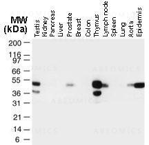 Fig:1 Western blot analysis of TRAF1 in normal human tissues using 20-1093 at 1:2000. TRAF1 is observed at 50 kDa. Additional bands of lower molecular weight were seen in some cases, and may represent TRAF1 degradation fragments.
