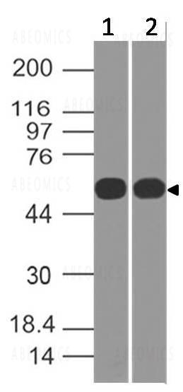 Fig-1: Western blot analysis of TRK Fused gene. Anti-TRK Fused gene antibody (11-8031) was used at 1 µg/ml on (1) h Intestine and (2) h Kidney lysates.