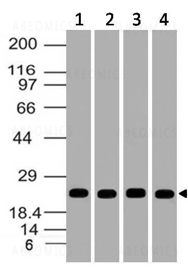 Fig-1: Western blot analysis of Uch-L1. Anti-Uch-L1 antibody (11-8096) was used at 1 µg/ml on (1) U87, (2) h Kidney, (3) 293 and (4) m Brain lysates.