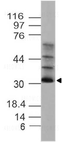 Fig-1: Western blot analysis of UCP4. Anti-UCP4 antibody (11-8046) was used at 4 µg/ml on A549 lysate.