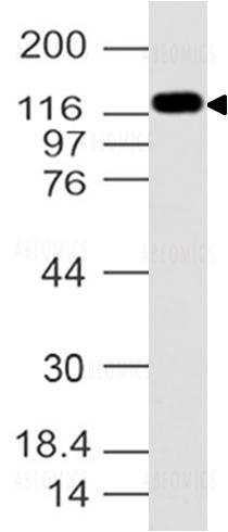 Fig-1: Western blot analysis of USP7. Anti-USP7 antibody (11-3009) was used at 4 µg/ml on A431 lysate.