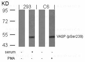 Figure 1: Western blot analysis of extracts from serum-treated 293 and PMA-treated C6 cells using VASP(Phospho-Ser239) Antibody 35-1151 .
