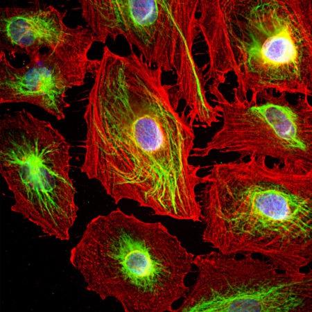 Figure-1: Immunofluorescence analysis of HeLa cells costained with rabbit pAb to vimentin,(34-1129), dilution 1:5,000, in green, and mouse mAb to Actin,(34-1002), dilution 1:500, in red. Blue is DAPI staining of nuclear DNA. The vimentin antibody stains the 10nm or intermediate filament network of the cytoskeleton. The antibody to actin labels the submembranous actin-rich cytoskeleton, stress fibers, and bundles of actin associated with cell adhesion sites.