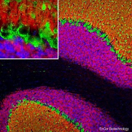 Figure-1: Immunofluorescent analysis of rat brain cerebellum section stained with chicken pAb to VLP, (34-1132), dilution 1:2,000 in red, and costained with mouse mAb to parvalbumin, dilution 1:1,000, in green. Following transcardial perfusion of rat with 4% paraformaldehyde, brain was post fixed for 24 hours, cut to 45 μM, and free-floating sections were stained with above antibodies. The VLP1 antibody reveals the protein expressed in the granule cells membranes and in the neuronal synapses of white matter and molecular layer of the cerebellum, while parvalbumin antibody labels Purkinje cells, basket, stellate, and Golgi cells.