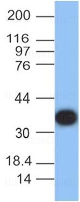 Figure-1: Western blot analysis of Protein A. Anti-Protein A antibody (Clone: ABM4B3.1G3) was used at 0.1 µg/ml on Recombinant protein.