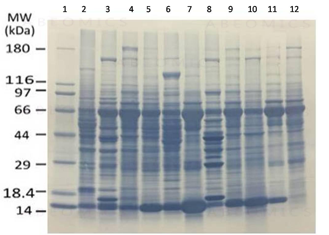 Fig-1: Quick-blotsTM of rat tissue (Cat No.: 16-1002): Different Rat tissue Lysates around 20 μg per lane were resolved by SDS-PAGE, trasfered on to PVDF membrane and stained with amido black. Lanes: 1. Molecular weight marker, 2. Brain, 3. Heart, 4. Small Intestine, 5. Kidney, 6. Liver, 7. Lung, 8. Skeletal Muscle, 9. Stomach, 10. Spleen, 11. Ovary, 12. Testis.