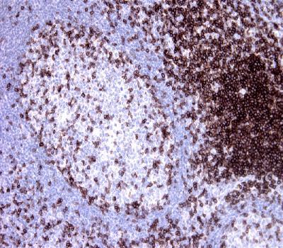 Figure-1: Tonsil section has been stained using CD3e antibody (Clone: BSR10) with 1:200 dilution. All T cells should be labelled and scattered T cells should be stainedfrom germinal center without stainingin B cells.