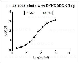 Figure-1 : ELISA binding of DYKDDDDK Tag Antibody (Clone: 114F12C8)on DYKDDDDK Tagged protein, Coating antigen: DYKDDDDK-tagged fusion protein at 1 µg/ml, DYKDDDDK Tag Antibody dilution start from 1,000 ng/ml, EC50= 47.78 ng/ml.