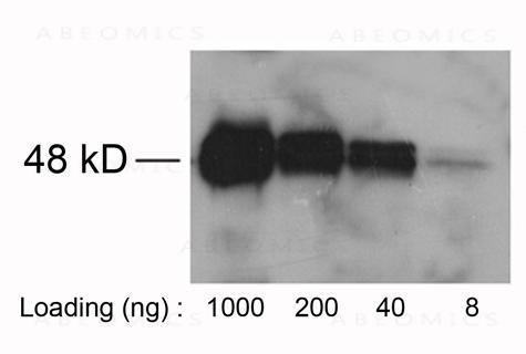 Figure-1 : Western blot analysis of Avi-tag Antibody at 1 μg/ml on Avi-tagged fusion protein (1000, 200, 40 & 8 ng)expressed in E. coli cell lysate.