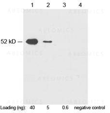 Figure-1 : Western blot analysis of c-Myc-tag Antibody at 1 µg/ml on c-Myc fusion protein (40, 5 and 0.6 ng) , Lane 1-3: HEK293 cell lysate and Lane 4: HEK293 cell lysate (as Negative Control).