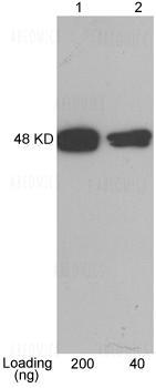 Figure-1 : Western blot analysis of CBP-tag Antibody at 1 µg/ml on CBP tagged fusion protein (200 & 40 ng) expressed in E. coli Cell Lysate.