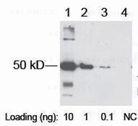 Figure-1 : Western blot analysis of DDDDK-tag Antibody on DDDDK tagged fusion protein in Lane 1-3 ( 10, 1 & 0.1 ng) expressed in E. coli lysates, Lane- 4: E. coli lysates as Negative Control.
