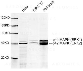 ERK (extracellular signal regulated kinase), also known as MAPK (mitogen activated protein kinase) includes two closely related isoforms ERK1 and ERK2 (p44 and p42 MAP Kinase). ERK1/2 signaling pathway can be activated in response to a diverse range of extracellular stimuli including mitogens, growth factors, and cytokines. The downstream effects of ERK1/2 signaling pathway are linked to the regulation of cell growth and differentiation as well as the cytoskeleton. Downstream targets of ERK1/2 contain p90RSK and the transcription factor Elk-1. ERK1 and ERK2 are phosphorylated within the activation loop on both a threonine and a tyrosine residue (within a Thr-Glu-Tyr motif) by MEKs (MAPK/ERK kinases), thereby greatly elevating the activity of ERK1/2. ERK1/2 are negatively regulated by a family of dual-specificity (Thr/Tyr) MAPK phosphatases. Rabbit Anti-ERK2 Polyclonal Antibody is developed in rabbit using a KLH-coupled synthetic peptide (KRIEVEQALAHPYLEQYYDPSDE) corresponding to 300-322 residues of human ERK2 (Swiss Prot: P28482).
