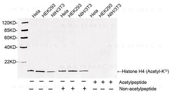 Histone H4 is a core component of nucleosome. It facilitates nucleosome wrapping and DNA compacting into chromatin, thereby limiting the DNAs accessibility to the cellular machineries for which DNA is required as a template. Histones play a central role in transcription regulation, DNA repair / replication and chromosomal stability. DNA accessibility is regulated via a complex set of post-translational modifications of histones, of which the process is called the histone code, and nucleosome remodeling. Rabbit Anti-Histone H4 (Acetyl-K12) Polyclonal Antibody is developed in rabbit using a KLH-coupled synthetic acetylpeptide corresponding to residues surrounding Lys12 of human Histone H4 (Swiss Prot: Q99525).