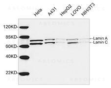 Lamins are structural protein components of the nuclear lamina which contains 3 members: Lamin A, B and C in mammalian cells. Lamin A and lamin C are generated by alternative splicing from the same gene and share complete identity for the first 566 amino acids. Lamin A interacts with transcription factor SREBP1 via its C-terminal domain. The lamin A/C deficiency is probably associated with both defective nuclear mechanics and impaired transcriptional activation. The lamin A/C is cleaved by caspase-6 and serves as a marker for caspase-6 activation. Rabbit Anti-Lamin A+C Polyclonal Antibody is developed in rabbit using a KLH-coupled synthetic peptide within residues 400-450 of human Lamin A (Swiss Prot: P02545).