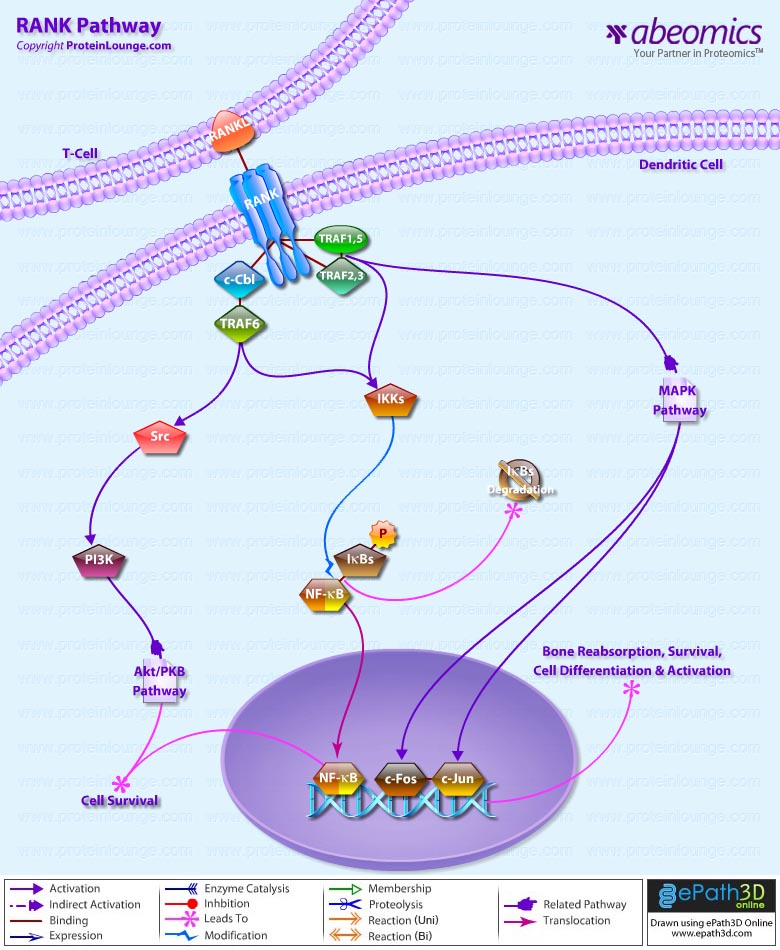 Bone remodeling and homeostasis is an essential function that regulates skeletal integrity throughout adult life in higher vertebrates and mammals. The structural and metabolic integrity of bone is maintained through the dynamic process of bone remodeling that results from the coordinate action of bone resorption by osteoclasts and the formation of new bone by osteoblasts. Regulation of bone remodeling occurs through multiple mechanisms that ultimately converge on the interaction of osteoclasts or their precursors with osteoblasts and bone marrow stromal cells. Key factors supplied by the stromal environment are cytokines such as IL-1, IL-11, IL-17, CSF1 (Colony Stimulating Factor-1) and the TNF receptor ligand family, RANKL (Receptor Activator of NF-kappaB Ligand; also known as OPGL, TRANCE, ODF and TNFSF11) and its receptor RANK (TNFRSF11A). Osteoclast activation is a critical cellular process for pathological bone resorption, such as erosions in Rheumatoid Arthritis or generalized bone loss (Ref.1 & 2).