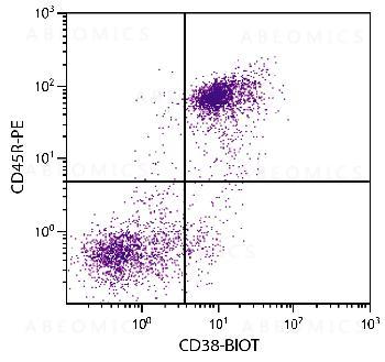 Figure 1: BALB/c mouse splenocytes were stained with Rat Anti-Mouse CD38-Biotin and Rat Anti-Mouse CD45R-PE followed by Streptavidin-FITC .