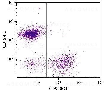 Figure 1: BALB/c mouse splenocytes were stained with Rat Anti-Mouse CD5-Biotin and Rat Anti-Mouse CD19-PE followed by Streptavidin-FITC .