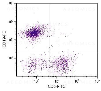 Figure 1: BALB/c mouse splenocytes were stained with Rat Anti-Mouse CD5-FITC and Rat Anti-Mouse CD19-PE .