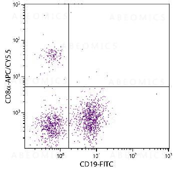 Figure 1: BALB/c mouse splenocytes were stained with Rat Anti-Mouse CD8a-APC/CY5.5 and Rat Anti-Mouse CD19-FITC .