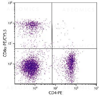 Figure 1: BALB/c mouse splenocytes were stained with Rat Anti-Mouse CD8a-PE/CY5.5 and Rat Anti-Mouse CD4-PE .