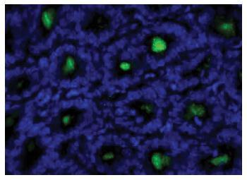 Figure 1: Mouse intestine tissue was stained with Rat Anti-Mouse IgA followed by Mouse Anti-Rat IgG1-FITC .