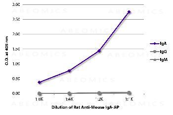 Figure 1: ELISA plate was coated with purified mouse IgM, IgG, and IgA. Immunoglobulins were detected with serially diluted Rat Anti-Mouse IgA-AP .