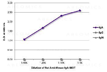 Figure 1: ELISA plate was coated with purified mouse IgM, IgG, and IgA. Immunoglobulins were detected with serially diluted Rat Anti-Mouse IgA-Biotin followed by Streptavidin-HRP .