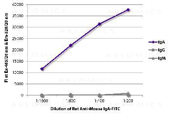 Figure 1: ELISA plate was coated with purified mouse IgM, IgG, and IgA. Immunoglobulins were detected with serially diluted Rat Anti-Mouse IgA-FITC .