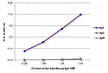 Figure 1: ELISA plate was coated with purified mouse IgM, IgG, and IgA. Immunoglobulins were detected with serially diluted Rat Anti-Mouse IgA-HRP .