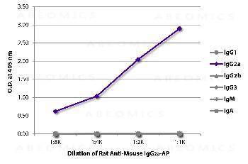 Figure 1: ELISA plate was coated with purified mouse IgG1, IgG2a, IgG2b, IgG3, IgM, and IgA. Immunoglobulins were detected with serially diluted Rat Anti-Mouse IgG2a-AP .