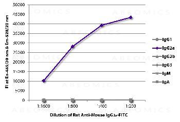 Figure 1: ELISA plate was coated with purified mouse IgG1, IgG2a, IgG2b, IgG3, IgM, and IgA. Immunoglobulins were detected with serially diluted Rat Anti-Mouse IgG2a-FITC .