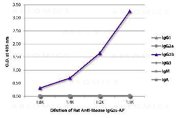 Figure 1: ELISA plate was coated with purified mouse IgG1, IgG2a, IgG2b, IgG3, IgM, and IgA. Immunoglobulins were detected with serially diluted Rat Anti-Mouse IgG2b-AP .