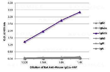 Figure 1: ELISA plate was coated with purified mouse IgG1, IgG2a, IgG2b, IgG3, IgM, and IgA. Immunoglobulins were detected with serially diluted Rat Anti-Mouse IgG2b-HRP .