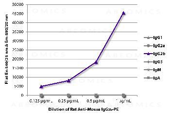 Figure 1: ELISA plate was coated with purified mouse IgG1, IgG2a, IgG2b, IgG3, IgM, and IgA. Immunoglobulins were detected with serially diluted Rat Anti-Mouse IgG2b-PE .