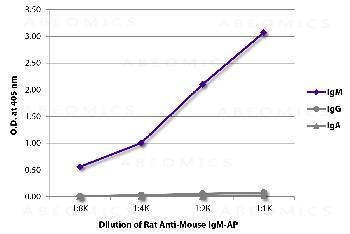 Figure 1: ELISA plate was coated with purified mouse IgM, IgG, and IgA. Immunoglobulins were detected with serially diluted Rat Anti-Mouse IgM-AP .