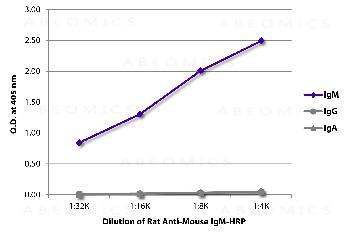 Figure 1: ELISA plate was coated with purified mouse IgM, IgG, and IgA. Immunoglobulins were detected with serially diluted Rat Anti-Mouse IgM-HRP .