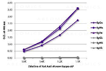 Figure 1: ELISA plate was coated with purified mouse IgGκ, IgMκ, IgAκ, IgGλ, IgMλ, and IgAλ. Immunoglobulins were detected with serially diluted Rat Anti-Mouse Kappa-AP .