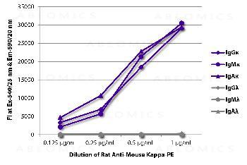 Figure 1: ELISA plate was coated with purified mouse IgGκ, IgMκ, IgAκ, IgGλ, IgMλ, and IgAλ. Immunoglobulins were detected with serially diluted Rat Anti-Mouse Kappa-PE .