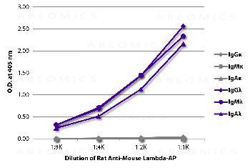 Figure 1: ELISA plate was coated with purified mouse IgGκ, IgMκ, IgAκ, IgGλ, IgMλ, and IgAλ. Immunoglobulins were detected with serially diluted Rat Anti-Mouse Lambda-AP .