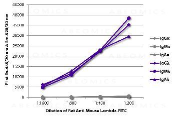 Figure 1: ELISA plate was coated with purified mouse IgGκ, IgMκ, IgAκ, IgGλ, IgMλ, and IgAλ. Immunoglobulins were detected with serially diluted Rat Anti-Mouse Lambda-FITC .