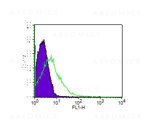 Fig.1: Cell Surface staining of splenocytes using 0.5 µgof Rat IgG2b isotype control. Goat anti-Rat FITC secondary antibody was used. Purple: cells alone, Green: rat IgG2b isotype control (10-107).